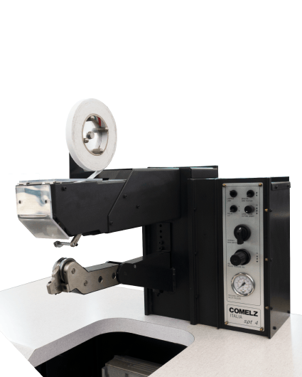 Il taglio del nastrino è comandato da una fotocellula che rende preciso il taglio, facile la regolazione della lunghezza e non richiede alcuna attenzione da parte dell'operatore. Il meccanismo di alimentazione e taglio è molto compatto e lascia all'operatore un'ampia visibilità del punto di lavoro; inoltre, le tomaie possono essere inserite consecutivamente, senza necessità di fermare la macchina e, quindi, con grande vantaggio per la produttività.